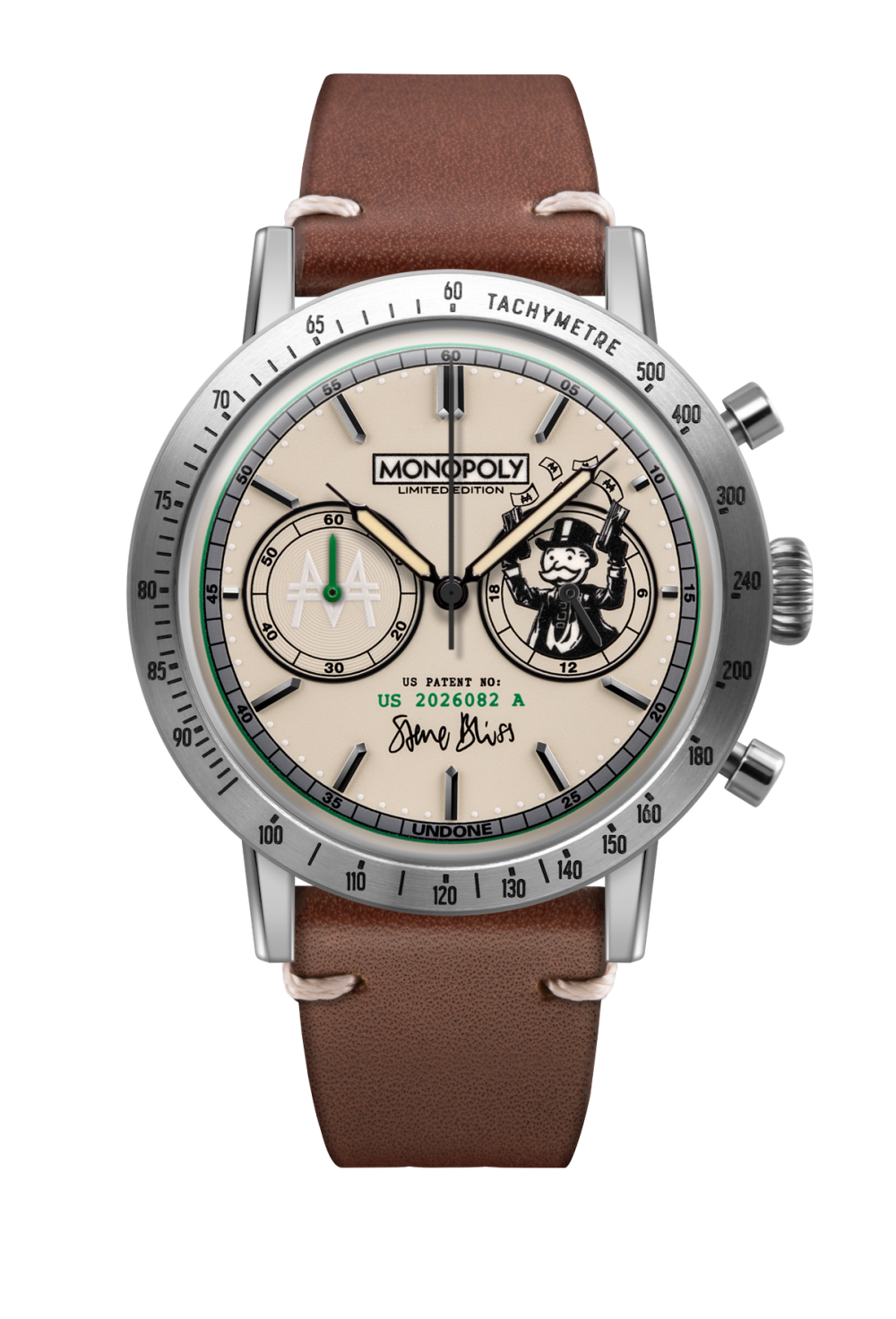 There are two different watches to choose from with the UNDONE x Monopoly Collection so you can choose the one that best suits your style. The first of which is “The Benjamin” by Stephen Bliss which is a United States Series 2006A, $100 bank note you can wear on your wrist. Signed off not by the US Secretary of Treasury but by Stephen himself; the dial boasts the authentic Monopoly board game patent number (“No.2,026,082” which was registered by the Parker Brothers back in December 31, 1935) cleverly disguised as a U.S. Mint issuance number. The green back themed watch is complimented by Genuine Brown Calf straps featuring UNDONE’s signature quick-release technology.