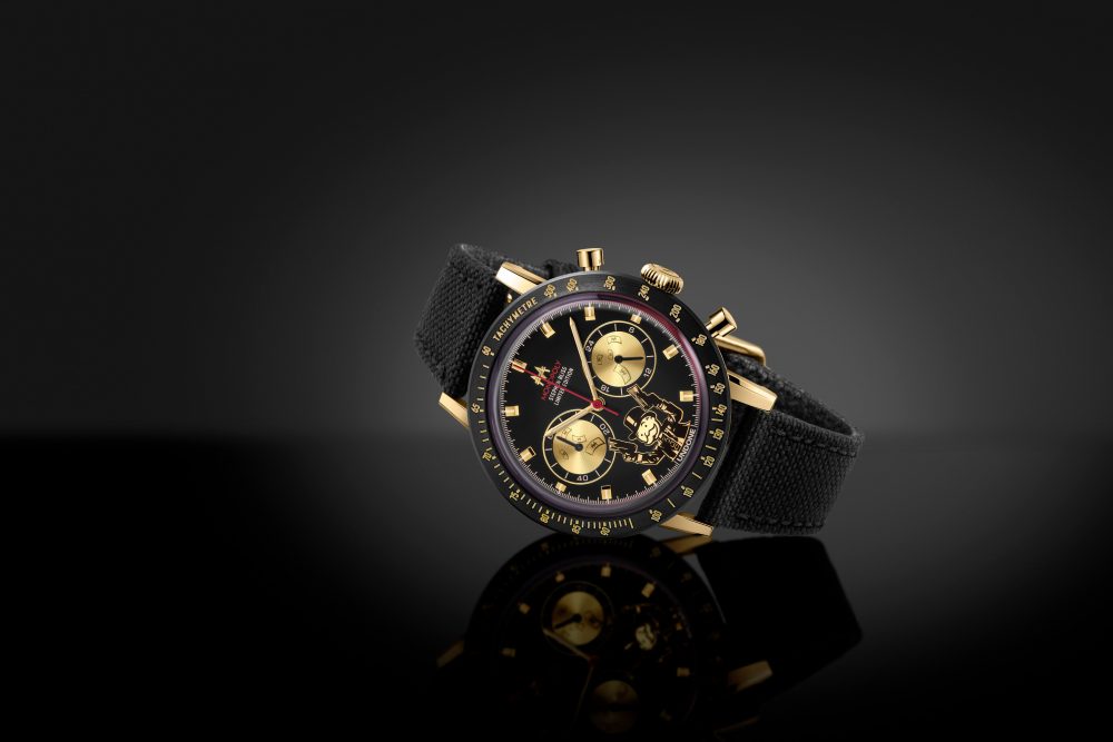 The second watch in the collection is “The Godfather” which has all the elements and subtleties that you would expect of a classy dress watch; applied indices, a Monopoly-red minute track along with the blend of brush and polished finishing which ensures an elegant feel without the garishness of too-much gold. The Black Cordura quick-release strap makes this a versatile piece which is ideally suited for both formal and casual occasions. The gold-pressed banknotes spraying out from Mr Monopoly’s twin cash cannons against the guillochéd subdials are only visible from certain angles. This is definitely a timepiece for those who want a real conversation starter on their wrist.