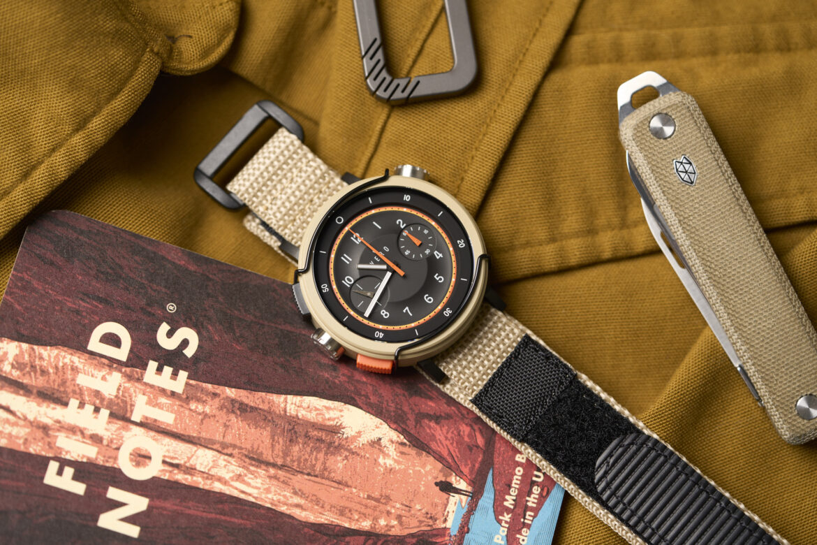 Oversized crowns and pushers on the Vero Workhorse Chronograph Watch ($425) create the illusion of a smaller size and are easy to use even when in an active situation. The “destro” or left-side design adds additional comfort on the wrist for the wearer, as well as straightforward access to the internal bezel crown at the two position. The Cerakoted shroud is protected from scrapes and bumps via a metal-wire bumper, which also adds to the overall uncompromising aesthetic of this timepiece.