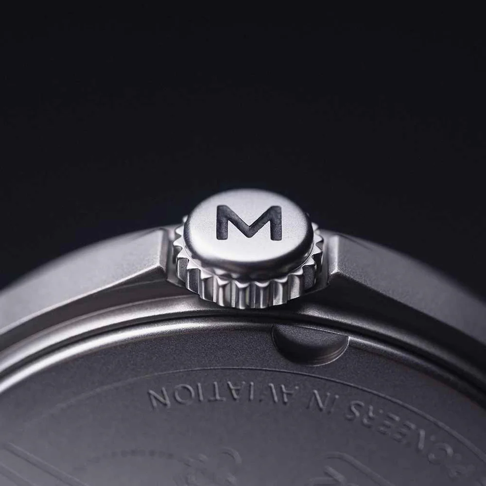 The case is crafted by turning on a lathe, mimicking 1930s manufacturing methods to create a clean, uni-body design with a multi-step blasted finish. It feels purposeful and engineered, rather than ornamental.