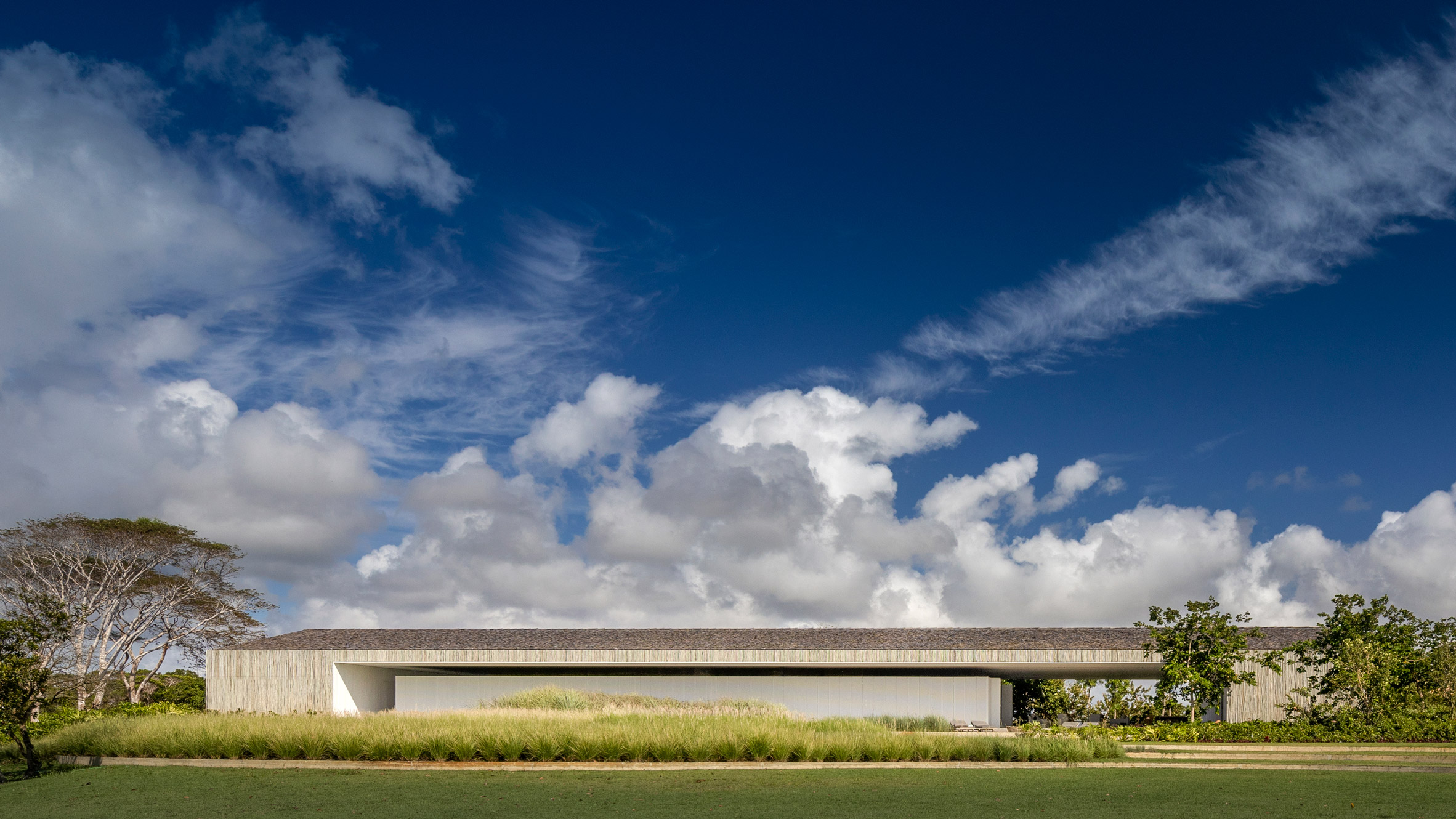 The home is made up of a low-slung, gabled roof that is around 15 metres wide, 3.5 metres tall, and 60 metres long – which, needless to say, creates an incredible visual impact upon approach. This impressive span is only enclosed at either end of the building, where Studio MK27 placed the kitchen and main bedroom, respectively. The outside of the home is beautifully wrapped in eucalyptus staves, while the roof is sheathed in hand-carved wooden shingles to help protect it from the elements.