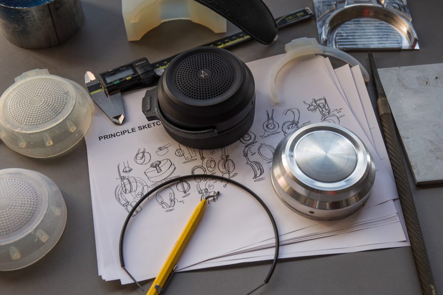 The Vokyl Erupt Gaming Headphones have a suspension headband system which has been custom designed for long hours of gaming. The machined aluminium cups boast an understated side silhouette but also celebrate a bold open back grill on their faces. This grill pattern is driven by a custom parametric script that creates non-uniform – radially arranged pattern of circles and, quite frankly, looks amazing.