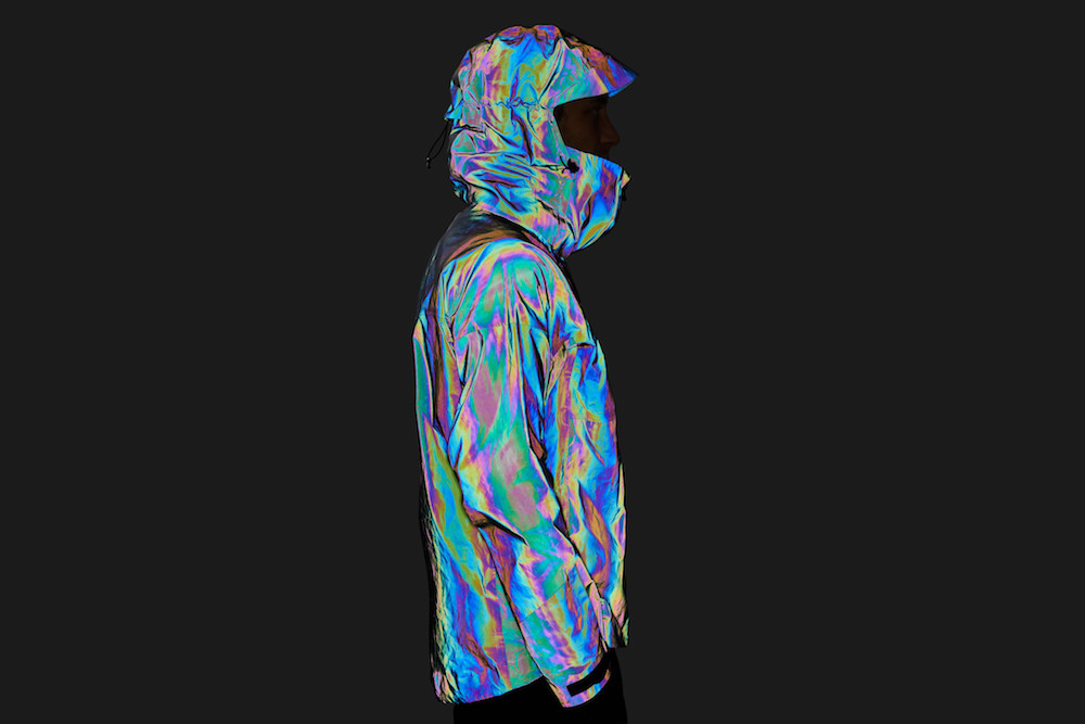 The beauty of the Vollebak Black Squid Jacket lies in the fact it changes so quickly and effectively its look. In sunlight it will look like liquid metal and when the flash is on, it looks like it’s from a different planet entirely. As the jacket reflects light straight back at the flash, it also directly strikes the lens – which makes the jacket look like it too is emitting light. At the same time the surface of the jacket scatters the remainder of the light to give it its mind-bending colour.