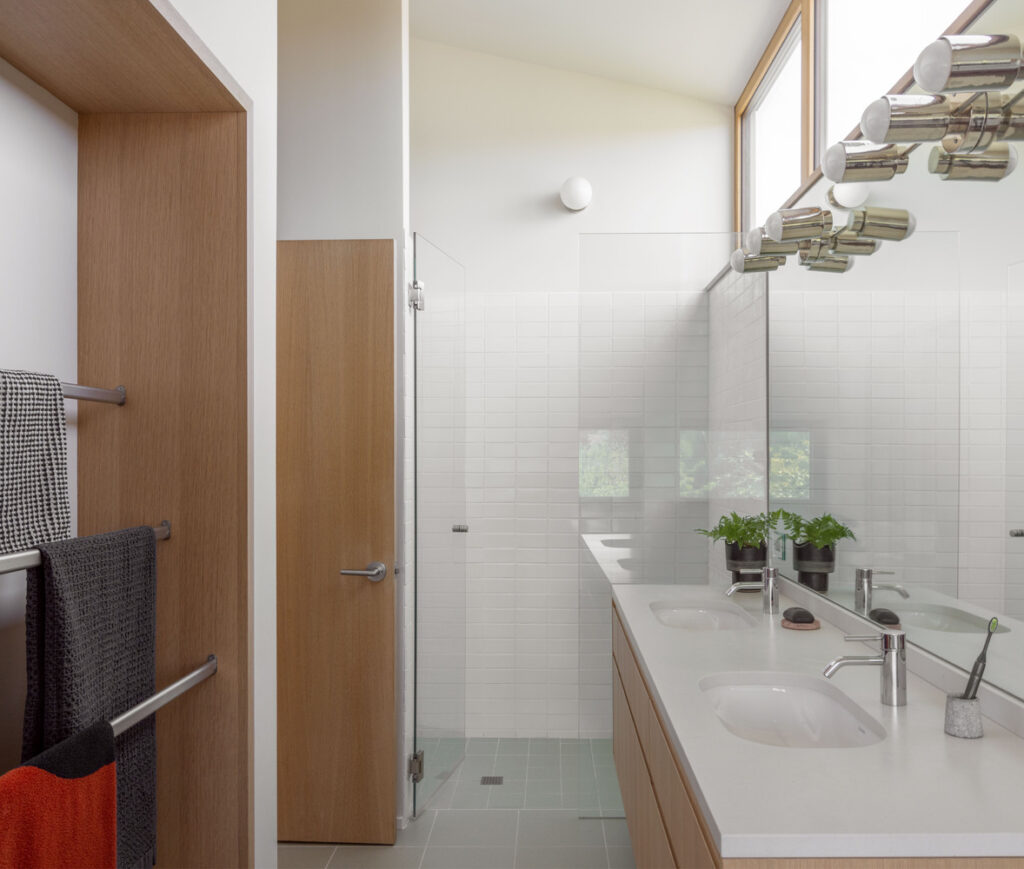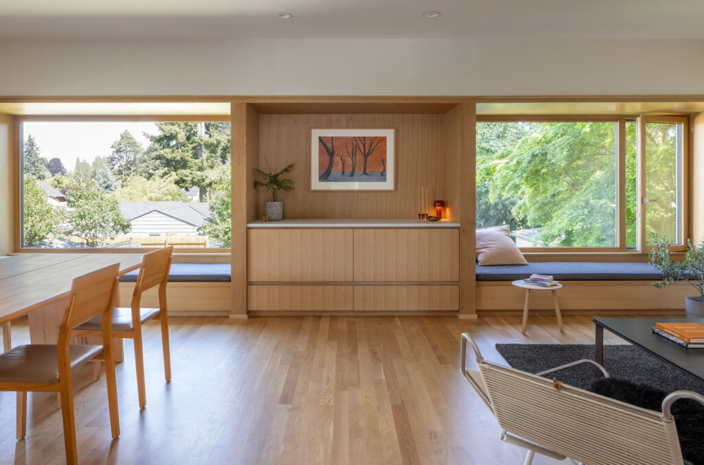 The house spans three thoughtfully designed levels. On the main floor, the entry and office space faces the street, while the living, kitchen, and dining areas open toward the backyard, bringing the outdoors in with large windows and built-in seating. The lower level hosts a guest suite, complete with a bathroom and sauna, as well as laundry and storage facilities. The use of the original foundation allowed the basement to be reimagined with high 8-foot ceilings, providing a spacious feel.