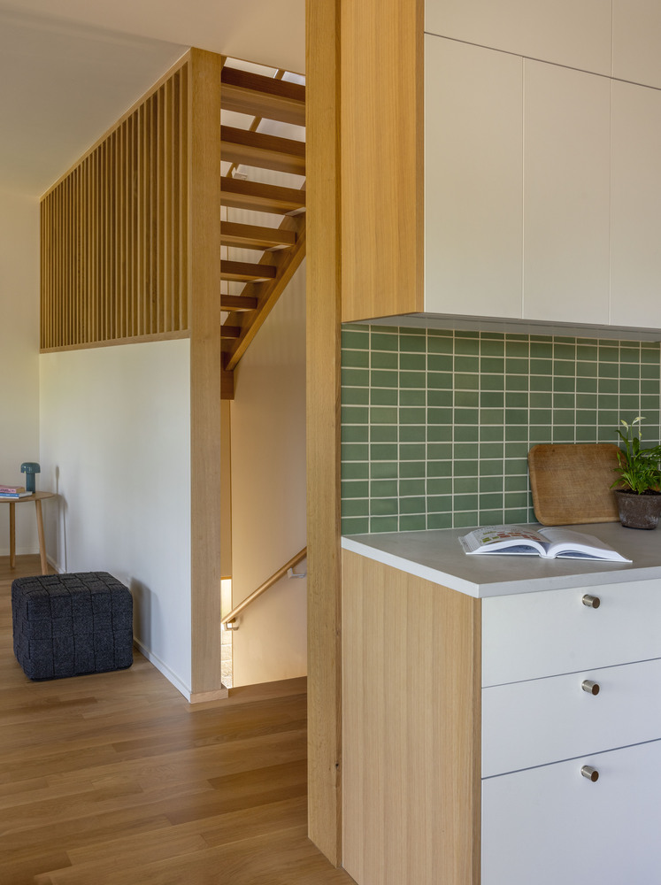 The exterior is clad entirely in wood, with a design language that echoes the traditional barns and mountain structures of Switzerland, paired with the Pacific Northwest’s modern sensibility. The sharp, jagged rooflines are reminiscent of the alpine peaks, while the home’s warm wooden facade exudes a welcoming vibe. The design leverages elemental materials and clean lines for a minimalist aesthetic, making the house stand out in its close-knit neighbourhood while harmonizing with the surrounding landscape.