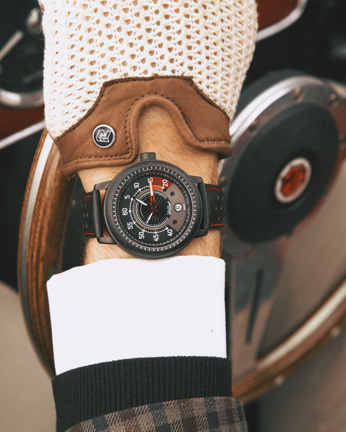 As with the cars of yesteryear, the Willer Automatic Watches are impeccably well crafted and you can observe through the transparent back lid the relaxing and hypnotic working of its engine – namely, the first class automatic Seiko NH35 movement. A clever design touch comes from now the dial resembles a tire in both shape and decoration. The same goes for the crown that looks like a wheel from the side and is shaped like a set of tires.