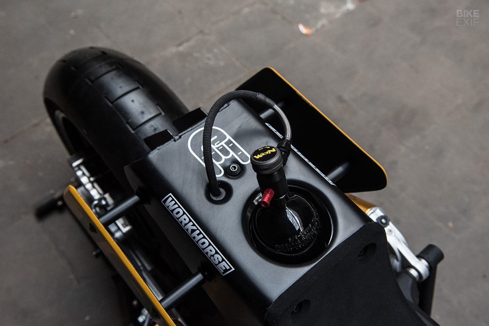 Everywhere you look with the Appaloosa there is a striking design detail to appreciate such as the use of quarter-turn fasteners throughout, so that bits of the fairing can come off quickly for maintenance. The fairing bracket is custom as well and consists of two parts with a new subframe, and new foot peg hangars too. Beringer provided the handlebar controls, and CNC machined a lot of smaller parts that Hennebert had designed.